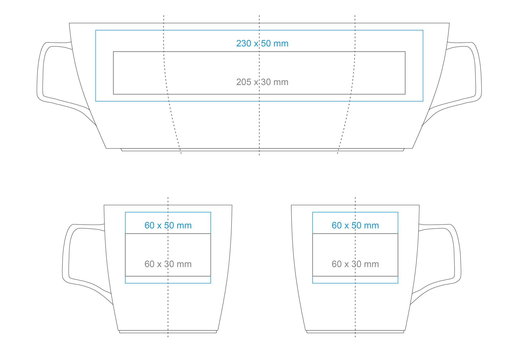 | Verfügbare Zusatzdekore Druck am Henkel (50×10 mm) Druck innen (Wand) (50×20 mm) Nadruk złotem Nadruk srebrem Nadruk transparentny Nadruk tablicowy Nadruk przez rant Hand made – malowanie rantu Termo Ink |
