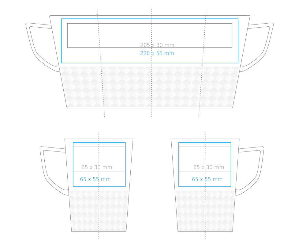 | Verfügbare Zusatzdekore Druck am Henkel (50×10 mm) Druck innen (Wand) (40×20 mm) Druck auf dem Boden (außen) (ø45 mm) Personalisierung Nadruk złotem Nadruk srebrem |