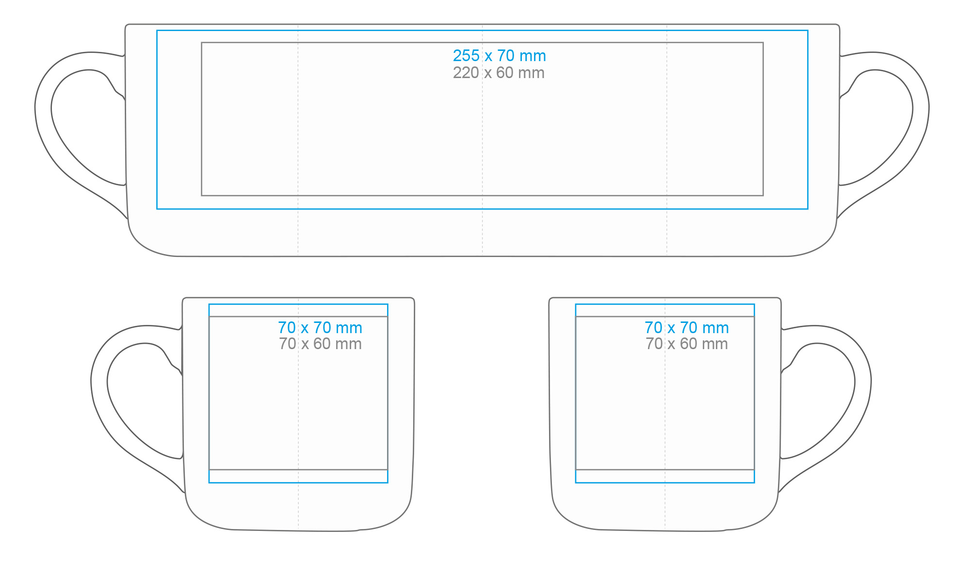 | Verfügbare Zusatzdekore Druck am Henkel (90×10 mm) Druck innen (Wand) (50×15 mm) Druck auf dem Boden (innen) (ø55 mm) Druck auf dem Boden (außen) (ø45 mm) Nadruk przez rant Hand Made – malowanie rantu Termo Ink |