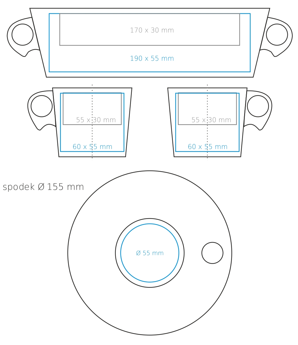 | Verfügbare Zusatzdekore Druck innen (Wand) (40×10 mm) Druck auf dem Boden (innen) (ø40 mm) Druck auf dem Boden (außen) (ø45 mm) Dekorstreifen Nadruk na spodku (55×55 mm) Dekorstreifen na spodku Nadruk aplą na spodku Personalisierung Nadruk złotem Nadruk srebrem Nadruk przez rant Hand Made – malowanie rantu Termo Ink |