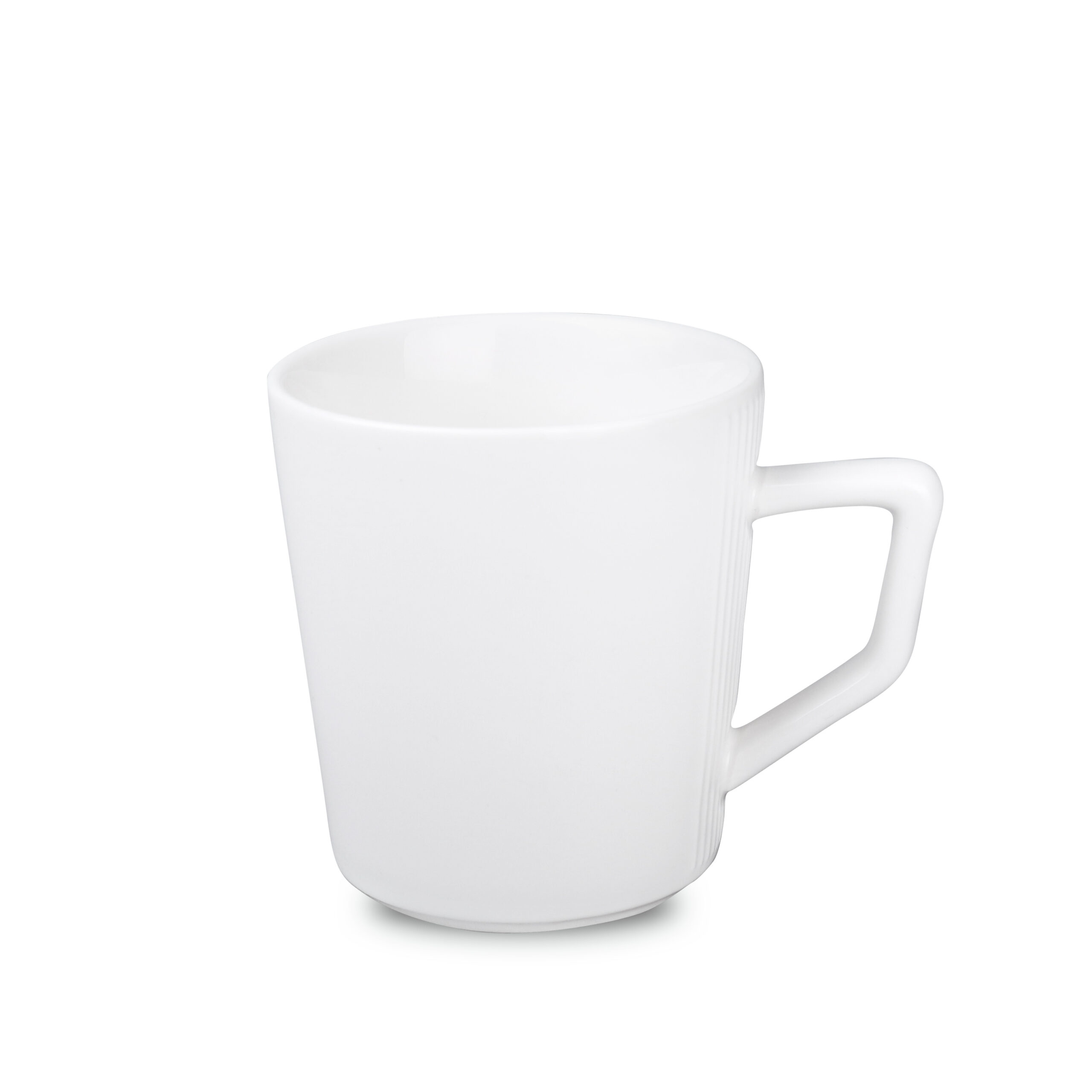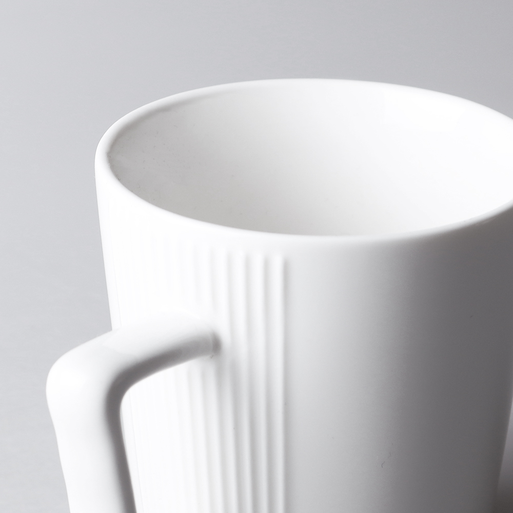 Dieser einzigartige Becher ist aus hochwertigem Porzellan gefertigt. Er besticht durch einen interessant gestalteten Henkel und eine Designerprägung auf beiden Seiten des Henkels.
