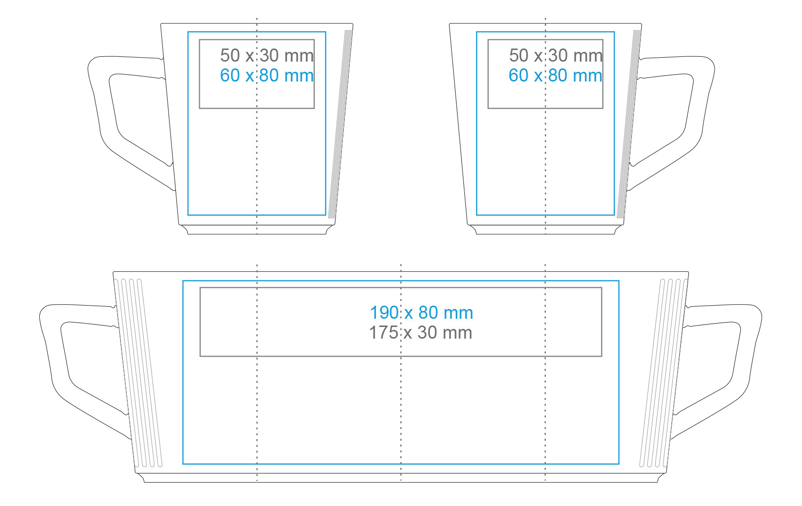 | Verfügbare Zusatzdekore Druck am Henkel (50×9 mm) Druck innen (Wand) (40×20 mm) Druck auf dem Boden (innen) (ø35 mm) Druck auf dem Boden (außen) (ø42 mm) Personalisierung Nadruk złotem Nadruk srebrem Handgefertigt – Randbemalung |