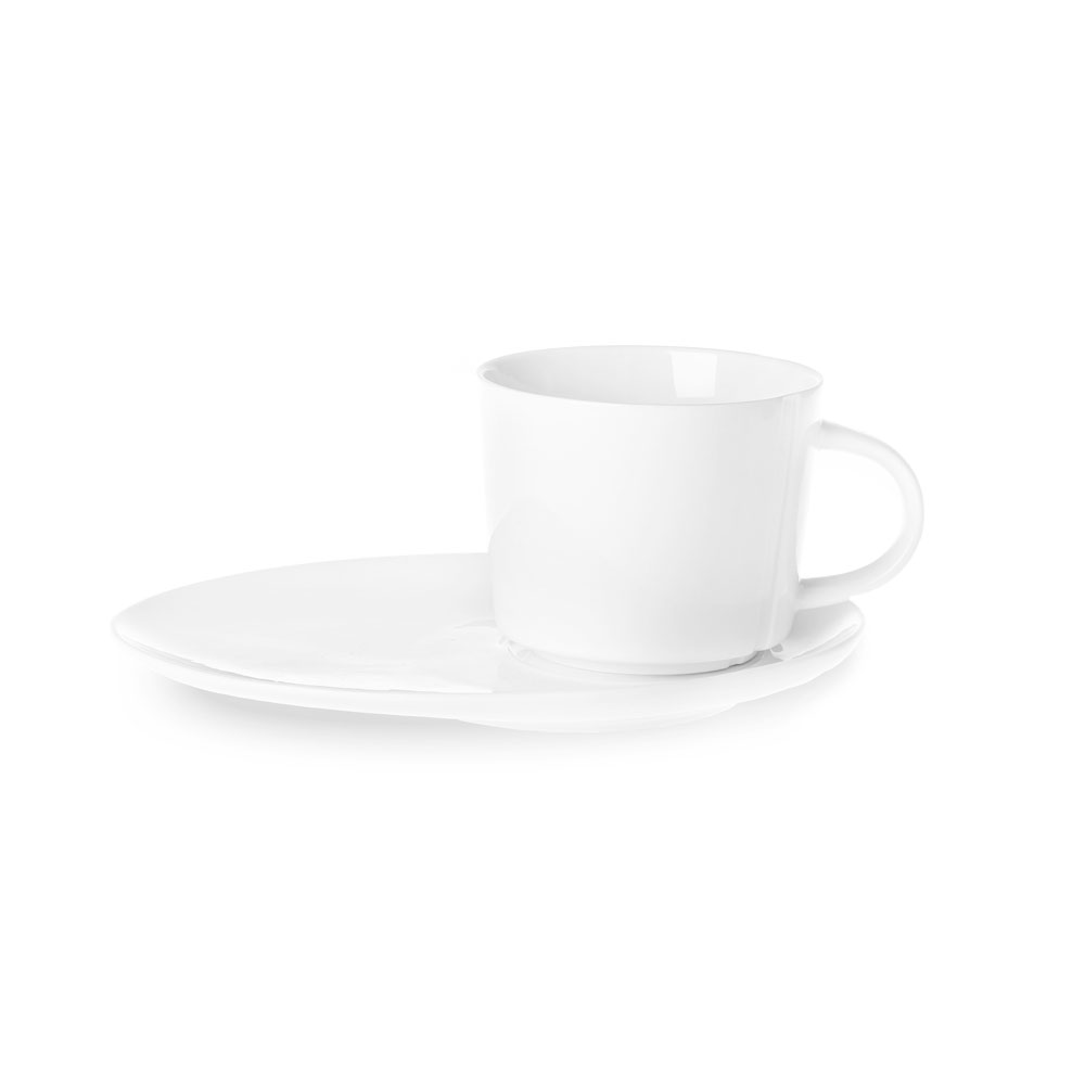 Ein Porzellanbecher, der sich durch die beidseitige Prägung des Henkels auszeichnet. Sein Design als Kuchenteller unterstreicht seine Originalität.