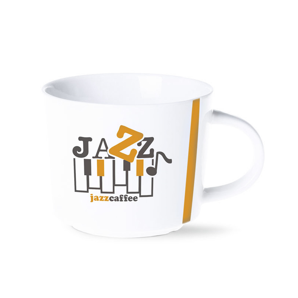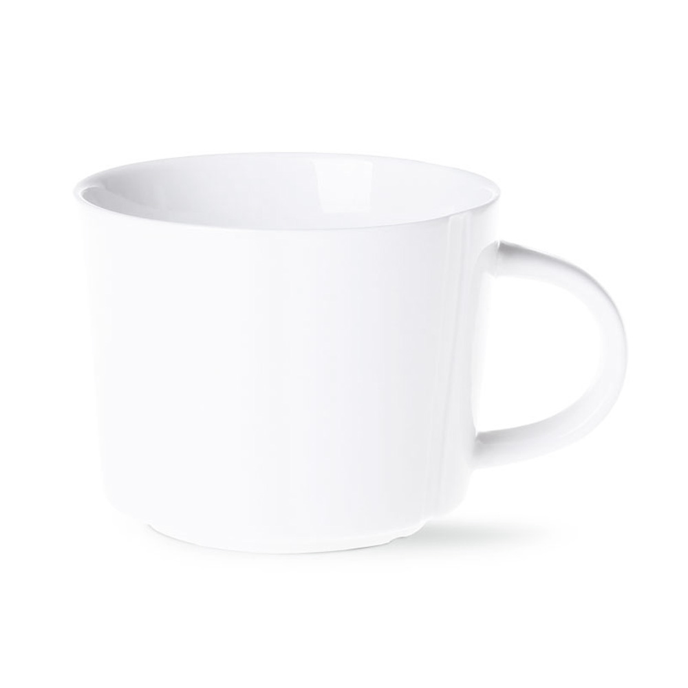 Ein großvolumiger Porzellanbecher mit einem markanten, geprägten Muster auf beiden Seiten des Henkels. Ein unverwechselbar originelles Design.
