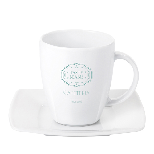 Jetzt können Sie auch beim Frühstück für Ihre Kunden da sein. Das Tassen- und Tellerset ist die perfekte Kombination. Bringen Sie Ihr Logo auf beiden Produkten an.
