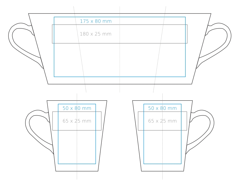 | Verfügbare Zusatzdekore Druck am Henkel (5×30 mm) Nadruk dookoła (pod uchem) Druck innen (Wand) (50×20 mm) Druck auf dem Boden (innen) (ø30 mm) Druck auf dem Boden (außen) (ø35 mm) Dekorstreifen Personalisierung Nadruk złotem Nadruk srebrem Nadruk tablicowy Hand Made – malowanie rantu Termo Ink |