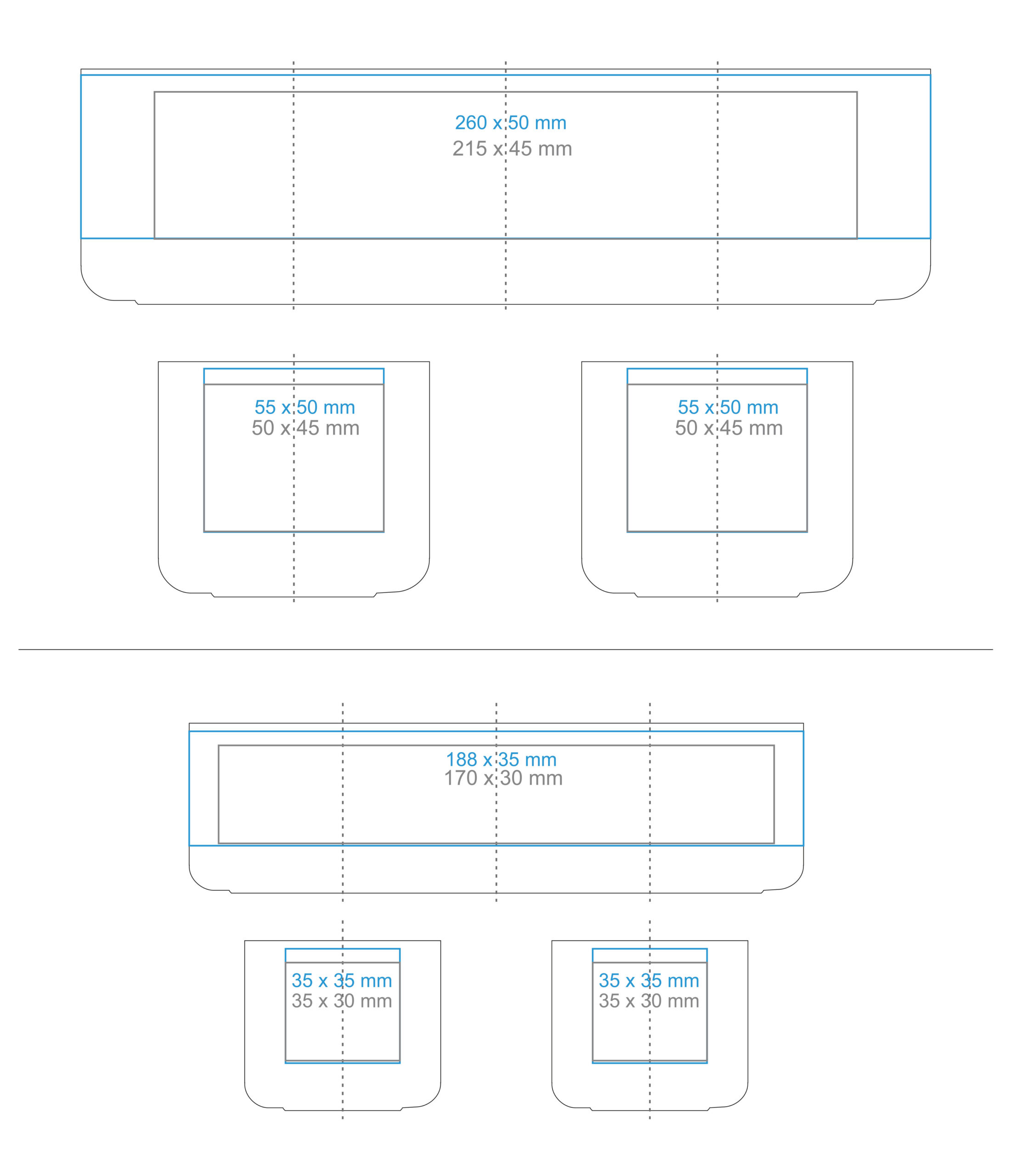 Verfügbare Dekortechniken Direktdruck ( 140×30 / 215x45mm) Transferfolie (35×35 / 55×50 mm) Transferfolie rundherum (188×35 /260×50 mm) Xpression – organische Transferfolie (35×35 / 55×50 mm) Xpression – organische Transferfolie rundherum (188×35 /260×50 mm) Sensitive Touch (55×50 / 55×50 mm) Sensitive Touch Color+ (55×50 / 55×50 mm) Hydrocolor Multicolor Bacecolor |