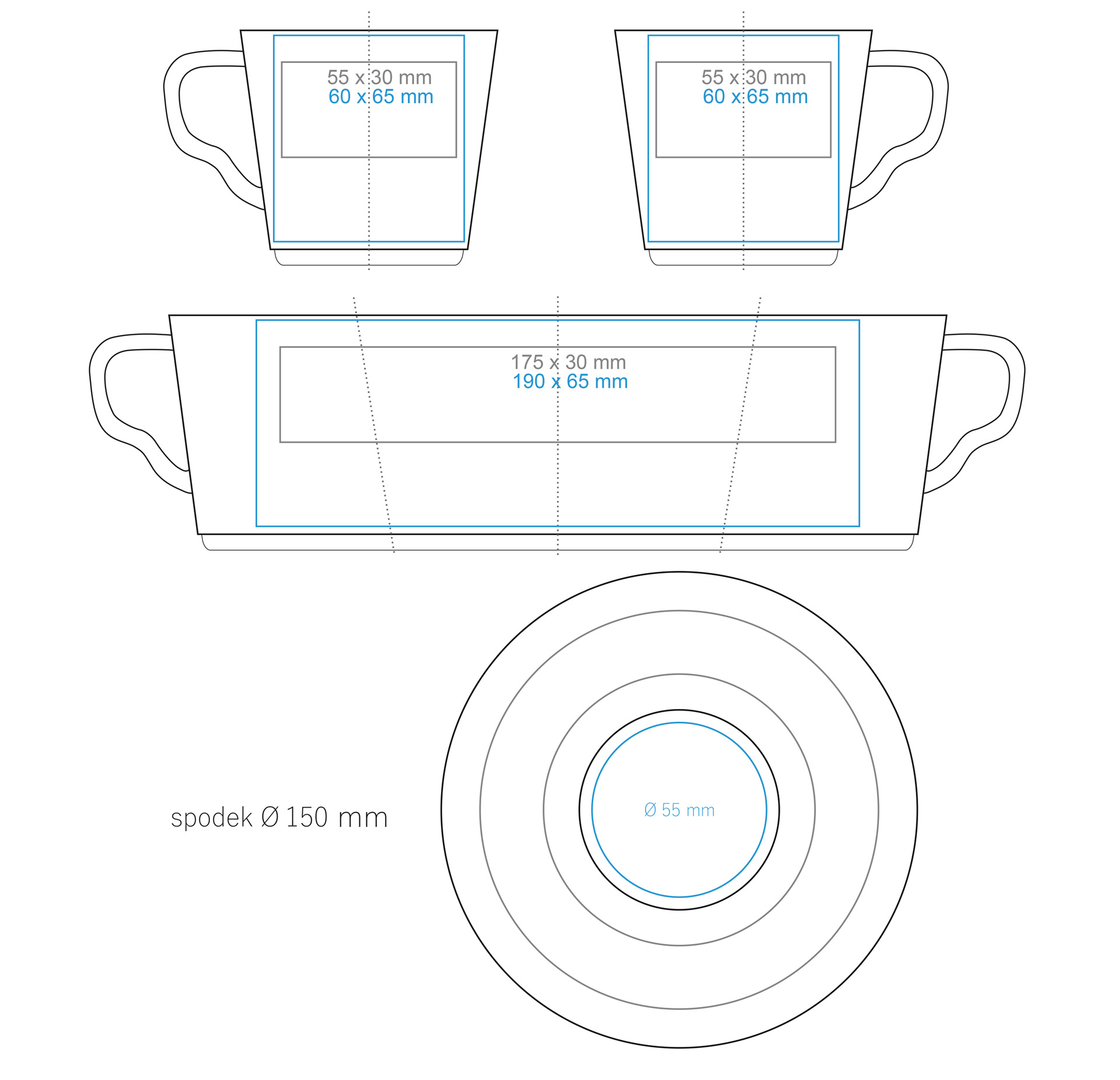 | Verfügbare Zusatzdekore Druck am Henkel (50×10 mm) Druck innen (Wand) (40×20 mm) Druck auf dem Boden (außen) (40×20 mm) Dekorstreifen Nadruk złotem Nadruk srebrem Hand Made – malowanie rantu Złocenie całej powierzchni ucha Personalisierung |