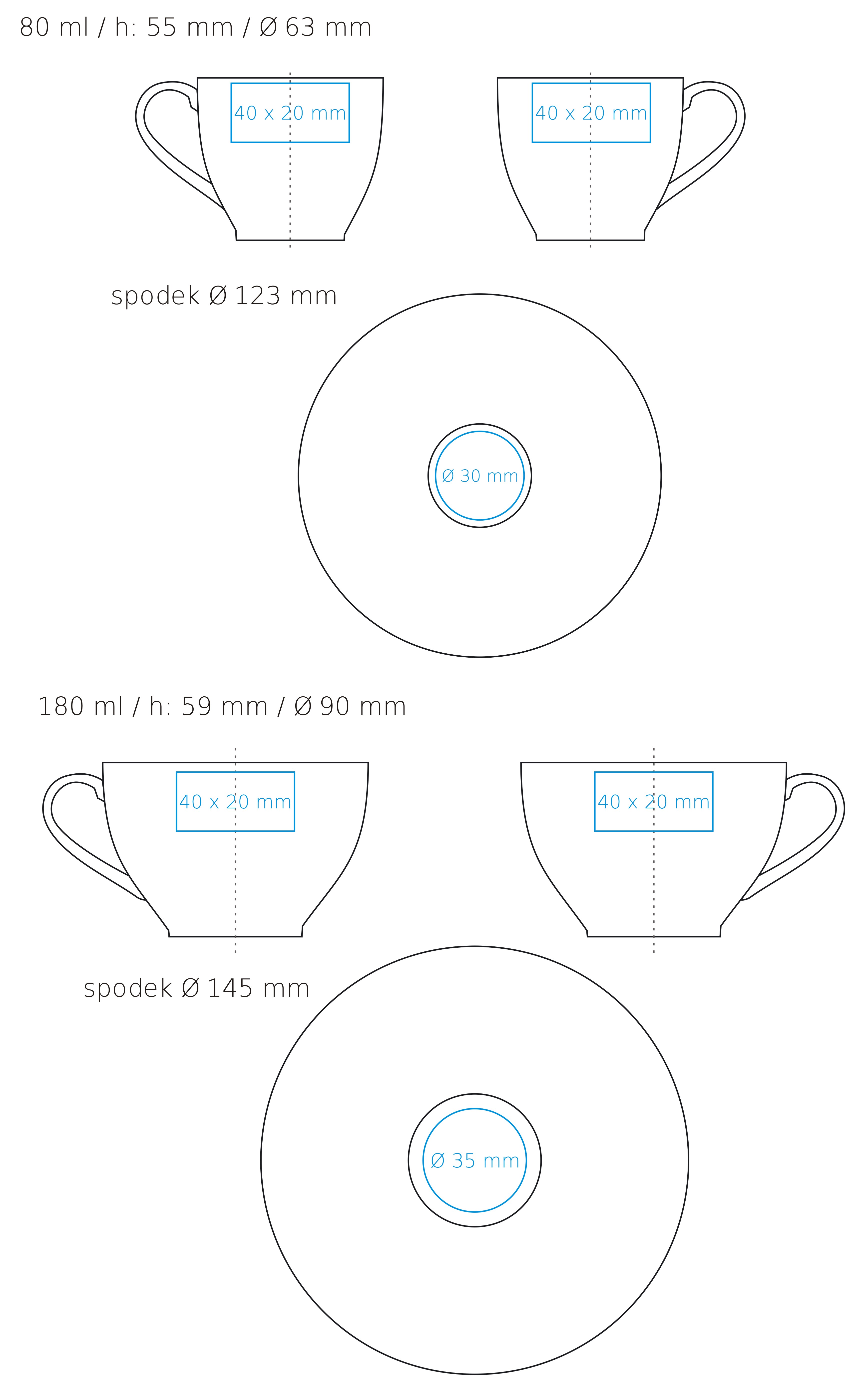 | Verfügbare Zusatzdekore Druck innen (Wand) (40×10 / 40×10 mm) Druck auf dem Boden (innen) (ø20 / ø20 mm) Druck auf dem Boden (außen) (ø25 / ø25 mm) Nadruk na spodku (ø30 / ø35 mm) Personalisierung Nadruk złotem Nadruk srebrem Zdobienie powierzchni obłej Nadruk przez rant Handgefertigt – Randbemalung |