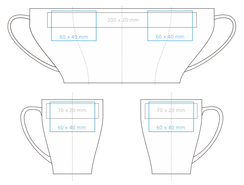 | Verfügbare Zusatzdekore Druck am Henkel (40×8 mm) Druck innen (Wand) (40×15 mm) Druck auf dem Boden (innen) (ø30 mm) Druck auf dem Boden (außen) (ø35 mm) Dekorstreifen Personalisierung Nadruk złotem Nadruk srebrem Zdobienie powierzchni obłej Nadruk tablicowy Nadruk przez rant Termo Ink |