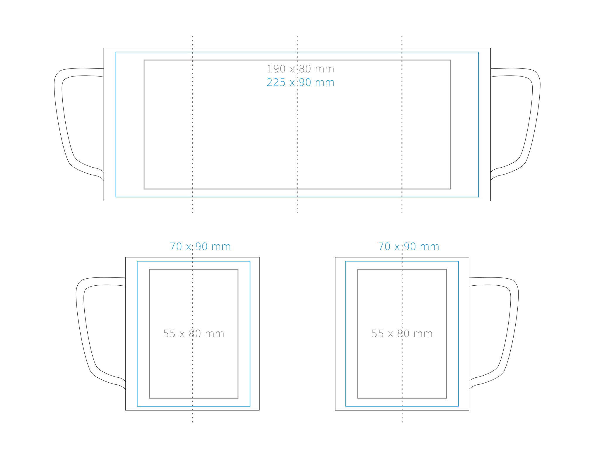 | Verfügbare Zusatzdekore Druck am Henkel (50×10 mm) Druck innen (Wand) (40×20 mm) Druck auf dem Boden (innen) (ø30 mm) Druck auf dem Boden (außen) (ø55 mm) Personalisierung Nadruk złotem Nadruk srebrem Nadruk tablicowy Nadruk przez rant Hand made – malowanie rantu Termo Ink |