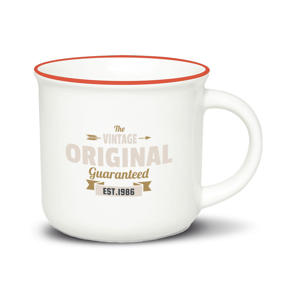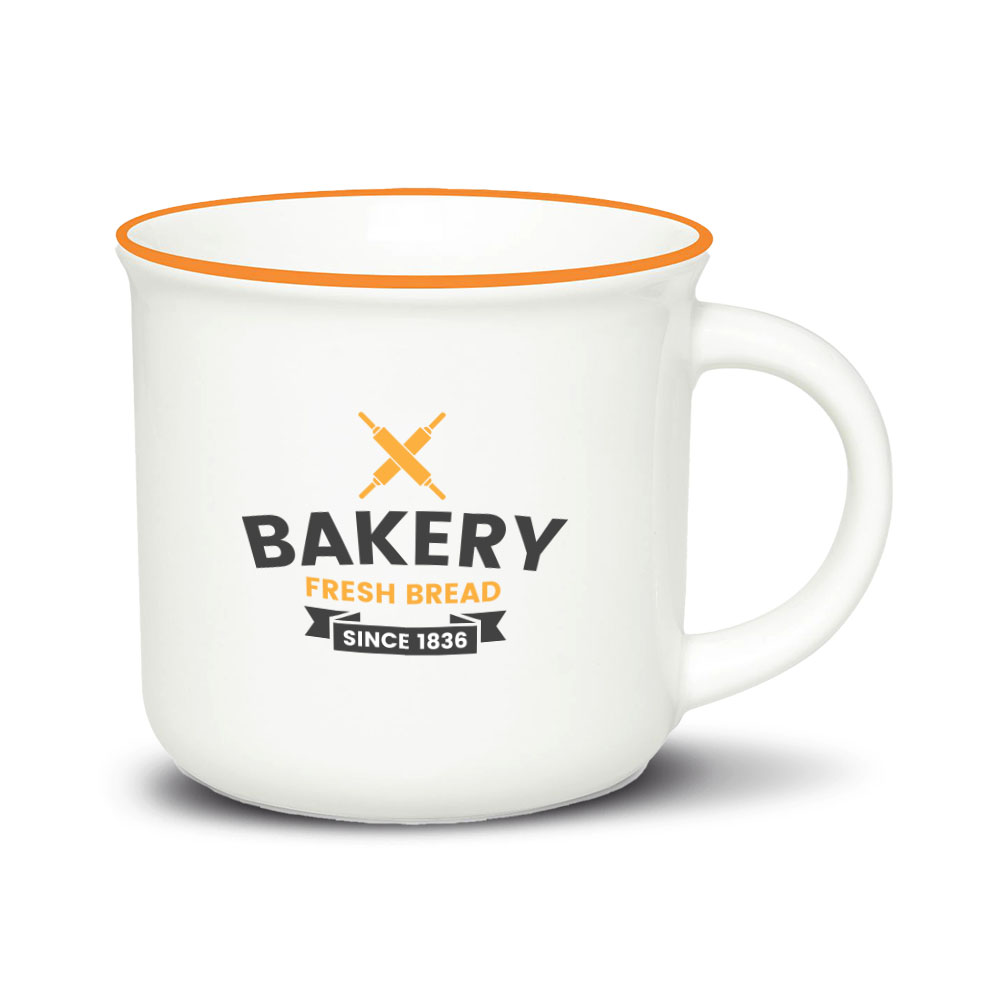 Ein cremeweißer Becher, dessen Form von traditionellen Emaillebechern inspiriert ist. Der gerollte Rand und der komfortable Henkel sorgen für außergewöhnlichen Trinkkomfort.