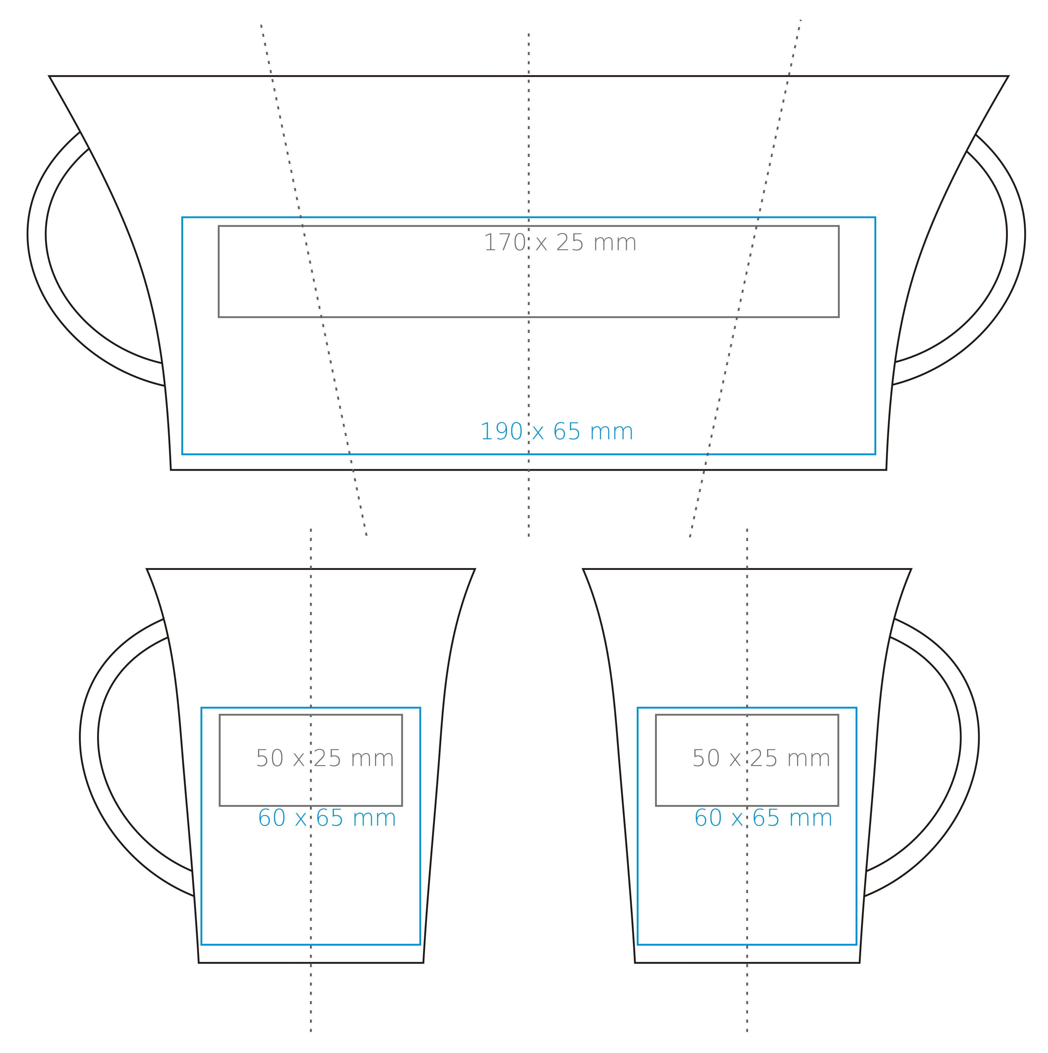 | Verfügbare Zusatzdekore Druck am Henkel (80×15 mm) Druck innen (Wand) (40×20 mm) Druck auf dem Boden (innen) (ø30 mm) Druck auf dem Boden (außen) (ø40 mm) Dekorstreifen Personalisierung Nadruk złotem Nadruk srebrem Zdobienie powierzchni obłej Nadruk tablicowy Nadruk przez rant Hand Made – malowanie rantu Termo Ink |