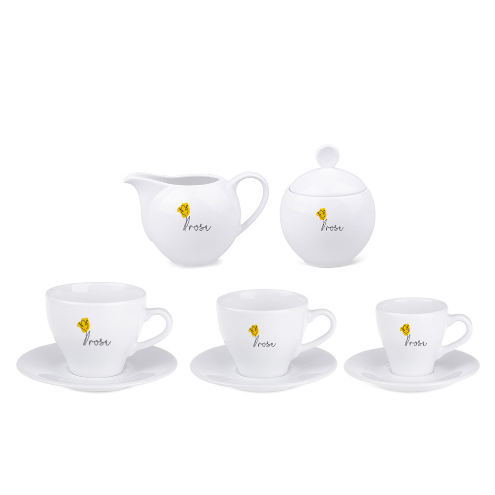 Ein elegantes Porzellanservice, bestehend aus mindestens 24 Teilen. Wir bieten die Möglichkeit, verschiedene Teile wie Tassen, eine Zuckerdose und ein Milchkännchen individuell zu kombinieren.