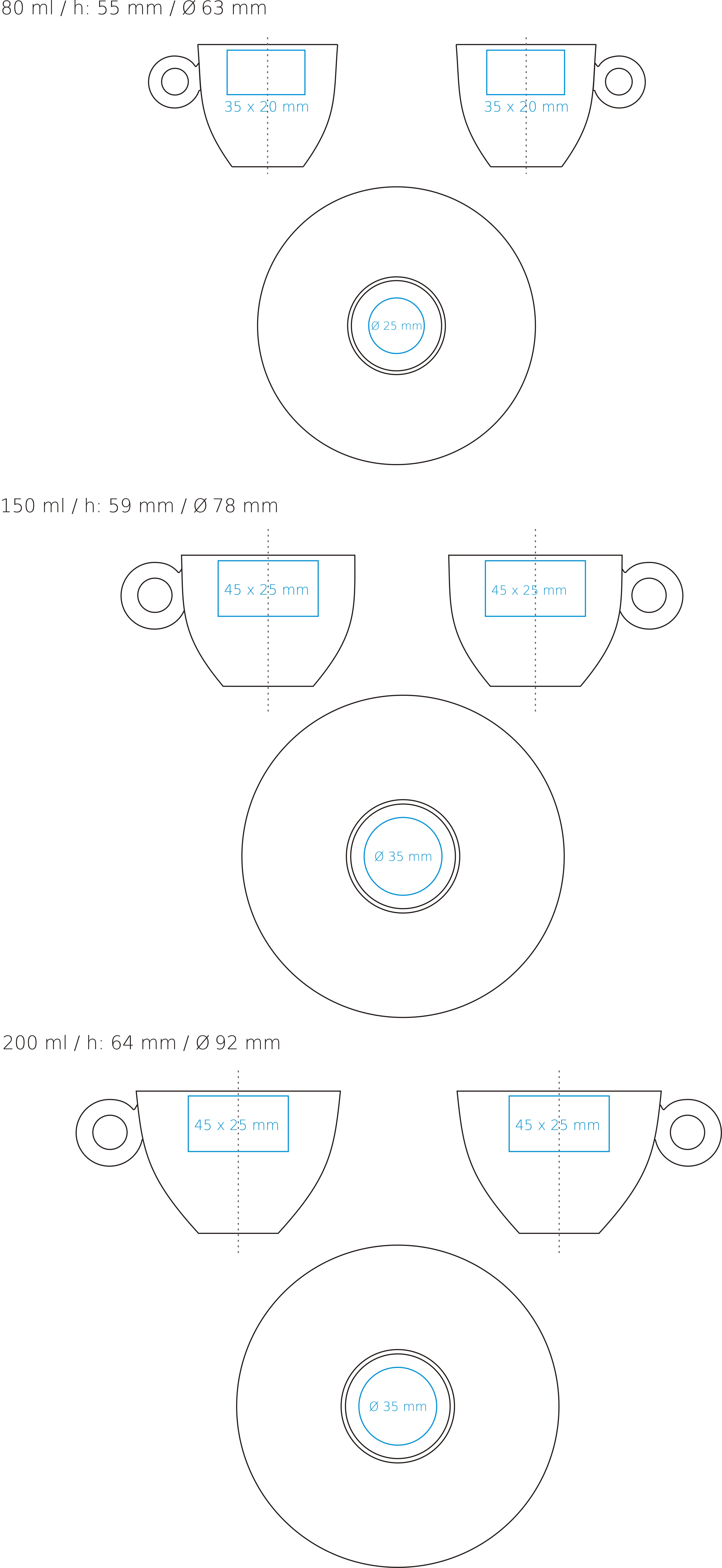 | Verfügbare Zusatzdekore Druck am Henkel (50×6 / 50×6 / 50×6 mm) Druck innen (Wand) (30×15 / 40×20 / 40×20 mm) Druck auf dem Boden (innen) ( ø10/ ø30/ ø30 mm) Druck auf dem Boden (außen) (ø15 / ø20/ ø20 mm) Nadruk na spodku (ø25 / ø35 / ø35 mm) Personalisierung Zdobienie powierzchni obłej |