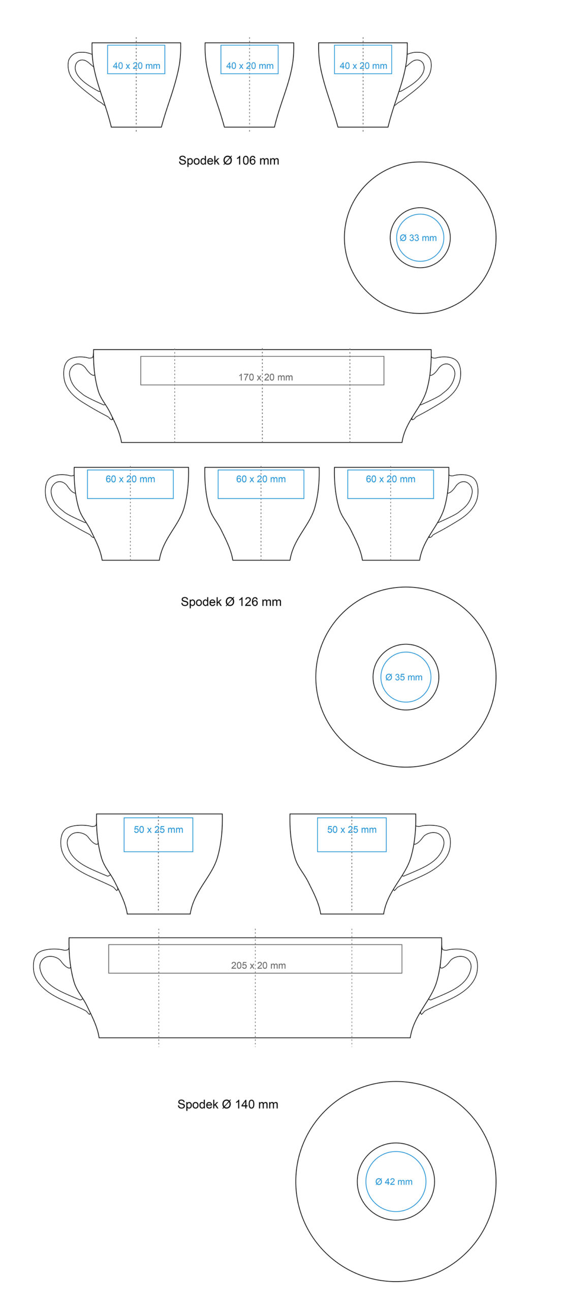 | Verfügbare Zusatzdekore Nadruk wewnątrz (ścianka) (30×10 mm) Nadruk na spodzie (zewn.) ( ø20 mm) Nadruk na dnie (wew.) (–/ ø25 / ø30 mm) Druck am Henkel (30×5 mm) Dekorstreifen Nadruk na spodku Dekorstreifen na spodku Nadruk złotem Nadruk srebrem Nadruk przez rant Personalisierung |